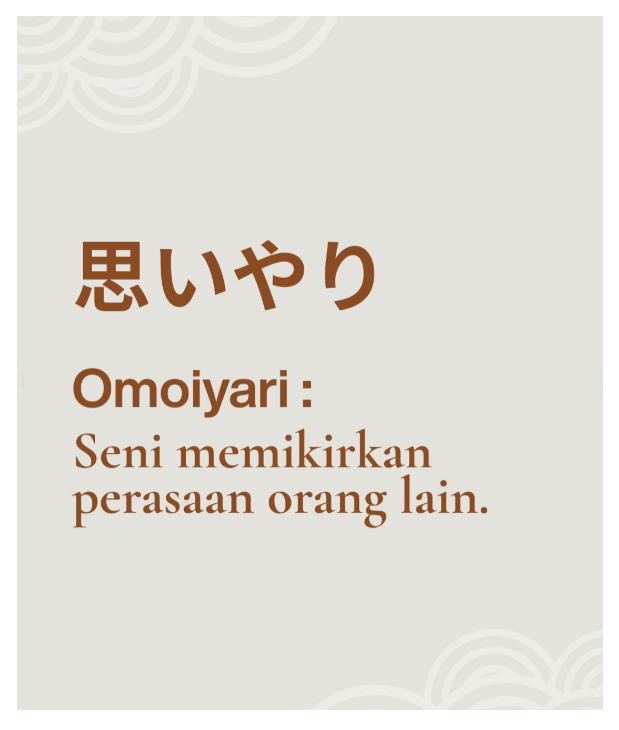 Budaya Jepang juga sangat menekankan Omoiyari, yaitu empati dan kepedulian pada orang lain. Inilah mengapa orang Jepang tidak berbicara keras di transportasi umum, membersihkan stadion setelah menonton bola, atau murid sekolah ikut membersihkan kelas.