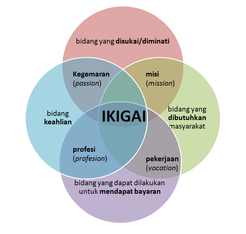 Lihatlah diagram itu. Lihat titik tengahnya. kita bisa mendapatkan semuanya, sesuatu yang kita cintai, sesuatu yang sangat kita kuasai, sesuatu yang dibutuhkan semua orang, dan tentu saja kita bisa hidup dengan hal itu karena kita mendapatkan bayaran yang pantas atasnya, semua secara utuh; itulah yang disebut Ikigai.