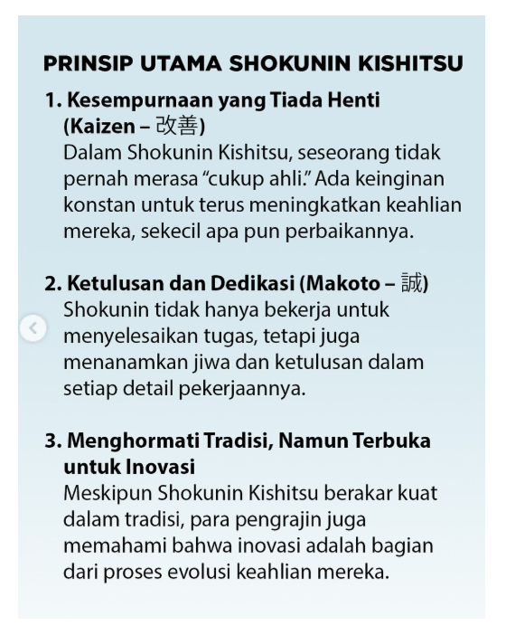 Orang Jepang memiliki istilah Shokunin Kishitsu, yaitu semangat untuk totalitas dalam pekerjaan apa pun, besar atau kecil. Seorang tukang kayu, sopir taksi, bahkan penjual makanan pun bekerja dengan penuh dedikasi. Bagi mereka, pekerjaan bukan sekadar mencari uang, tetapi sebuah kehormatan.